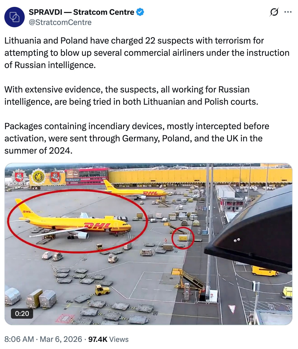 The charges are being tried in national courts in Vilnius and Warsaw. The European Union Agency for Criminal Justice Cooperation notes that the investigation discovered “test packages” sent to the United States and Canada, suggesting that the operation may have been probing routes for future attacks on North America.