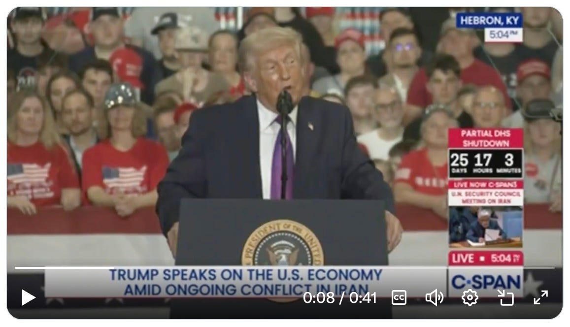 AND FINALLY, a meditation on the state of the nation. From a campaign speech on March 11th on behalf of a challenger to Republican Congressman Thomas Massie of Kentucky, who wants the Epstein files out.