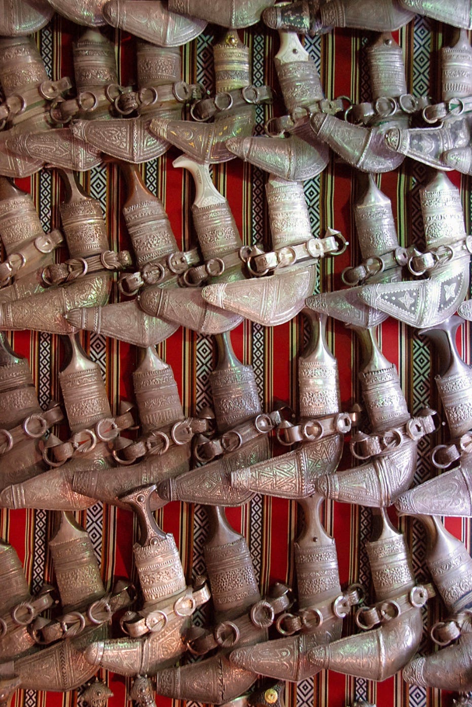 The answer to this week’s photo quiz? It’s Oman. The two architectural shots are one interior and one exterior of the Sultan Qaboos Grand Mosque in Muscat, the skyline is Muscat, the capital, and the weaponry as shown in a shop in the Muttrah souk is the Khanjar, the traditional Omani dagger, similar to the Jambiya down the coast in Yemen.
