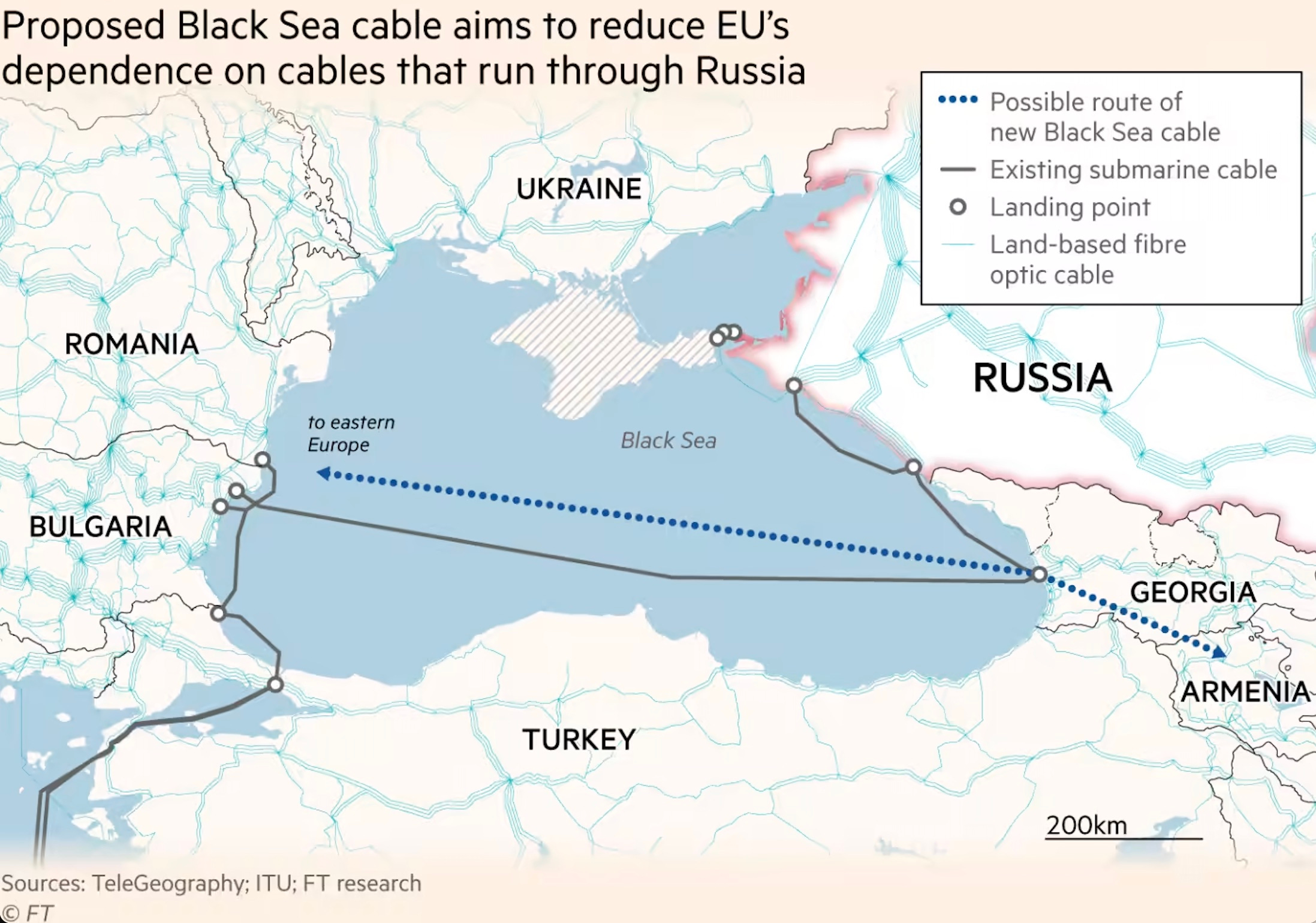 The EU keeps the pressure on the Russian periphery with a proposed undersea internet cable to Georgia across the Black Sea. Chart from this article in the FT.