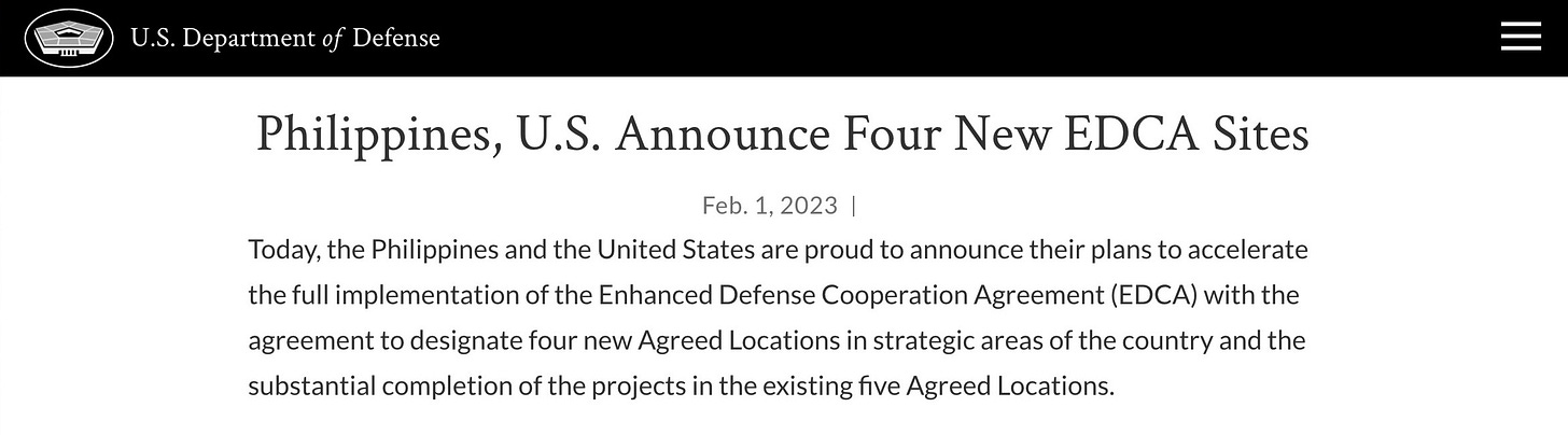 The American Defense Secretary Lloyd Austin visited Bongbong Marcos in the Philippines last week. Marcos cast his country’s lot with the US in the event of a Chinese invasion of Taiwan. The Austin visit added four bases to the existing Enhanced Defense Cooperation Agreement (EDCA) allowing US troops access.