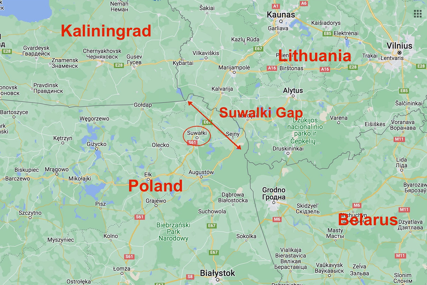 By standing agreement, rail traffic between Russia and Kaliningrad moves across Lithuania over around 120 miles of track. This would obviously be a point of conflict in any fighting. Here is another: when the Baltic republics of Estonia, Latvia and Lithuania came under the NATO umbrella in 2004, a famous worry was the Suwalki Gap, here: