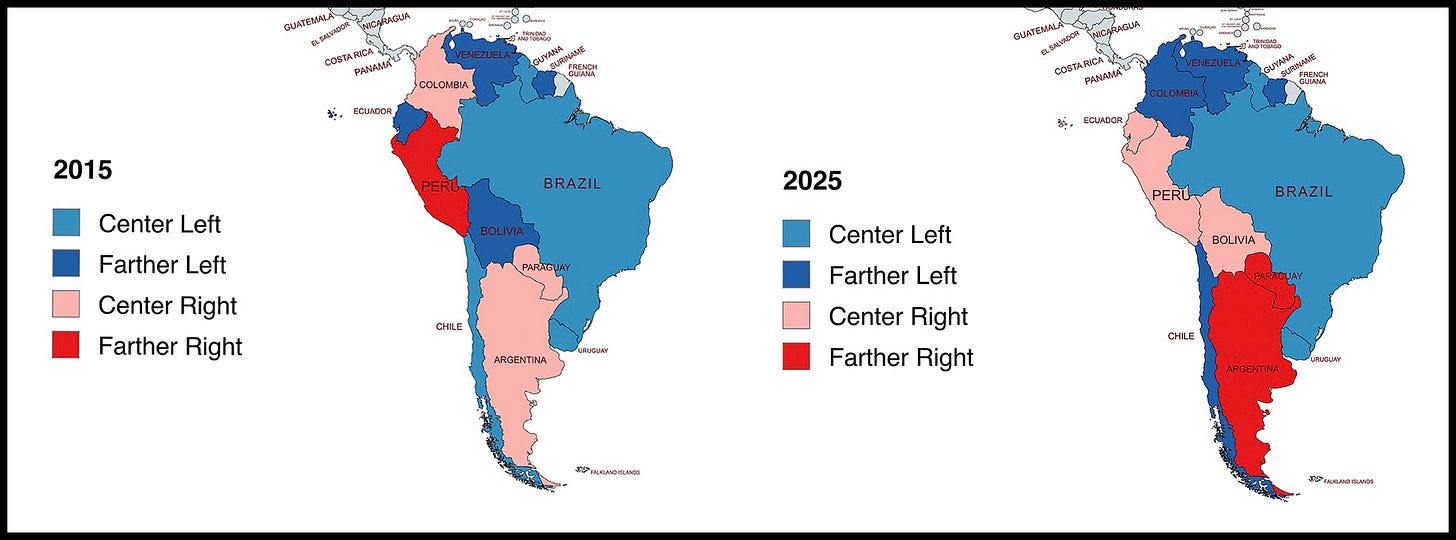 It will be a radical change for Chile, which got me wondering whether movement to the right is a trend in South American politics. Here is a comparison of ruling parties in the South American countries ten years ago versus today. If Chile flips to deep red on Sunday, that will confirm a rightward trend. Not a rightward march, exactly, but we’ll see six right of center governments among South America’s twelve independent countries versus four a decade ago. (French Guiana doesn’t count. It’s not a country, it’s French.)