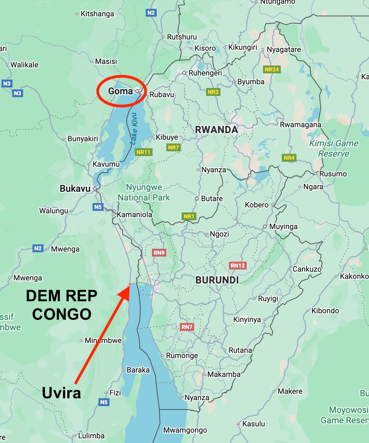As you can see on the map, the Great Rift Valley lakes Kivu and Tanganyika form part of the border between Congo to the west and Rwanda and Burundi to the east. Until this year M23’s heartland had been to the north of Goma, but with its arrival in Uvira, the rebel group has penetrated south all the way past Bukavu to Lake Tanganyika.
