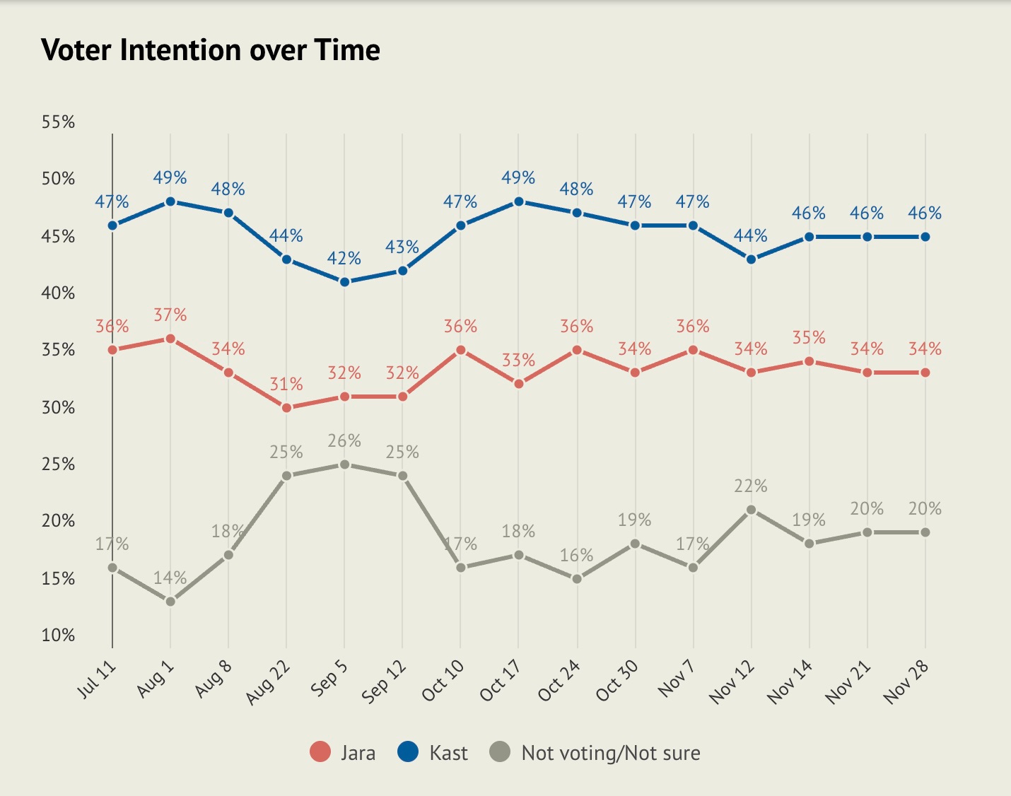 Boric’s governing leftist coalition’s is standing Jeannette Jara, a member of the Communist Party, against far-right candidate Jose Antonio Kast, who has a commanding lead in tracking polls, like so: