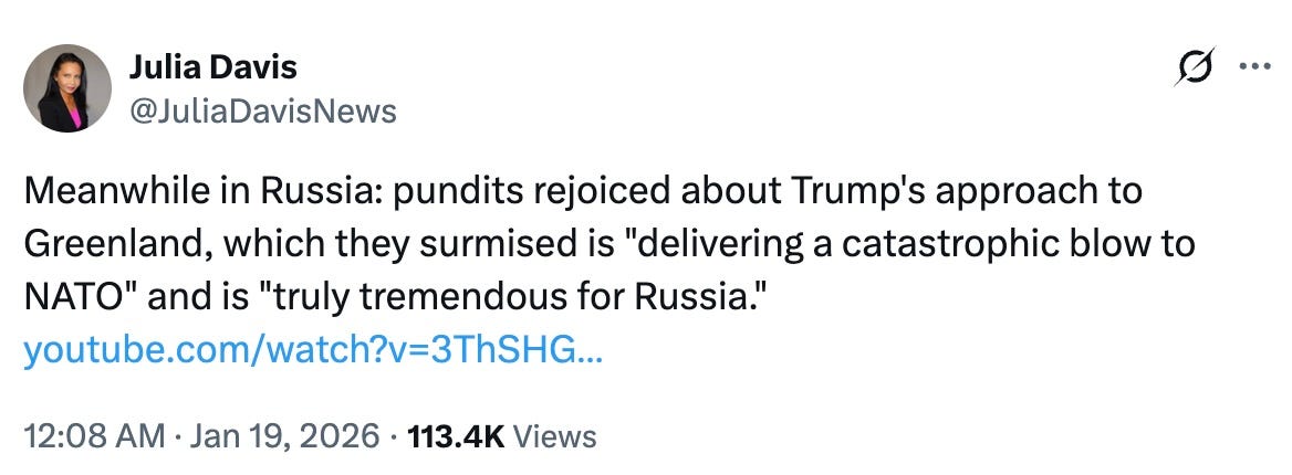 ALLIANCE LOST: The Trump administration has all points west of Moscow in uproar this week for saying America needs Greenland, or else the Russian military will seize it. So demanding the US take Greenland away from Moscow is sure to make the Russians who covet it very, very angry. Right?