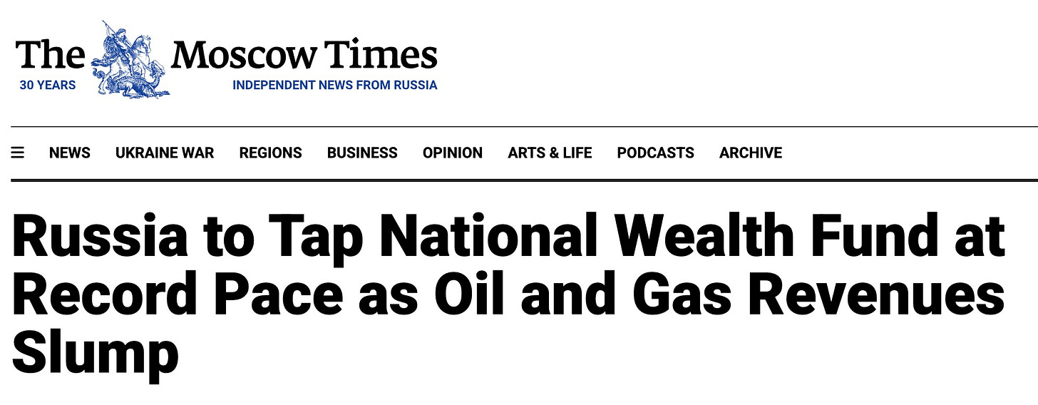 • PIGGY BANK RAID: Falling oil revenue is drawing down Moscow’s rainy day fund. Before Russia’s full-scale invasion of Ukraine in 2022, its National Wealth Fund held $113.5 billion in liquid assets - foreign currency and gold held at the Central Bank. At the beginning of 2026 it held $52.9 billion.