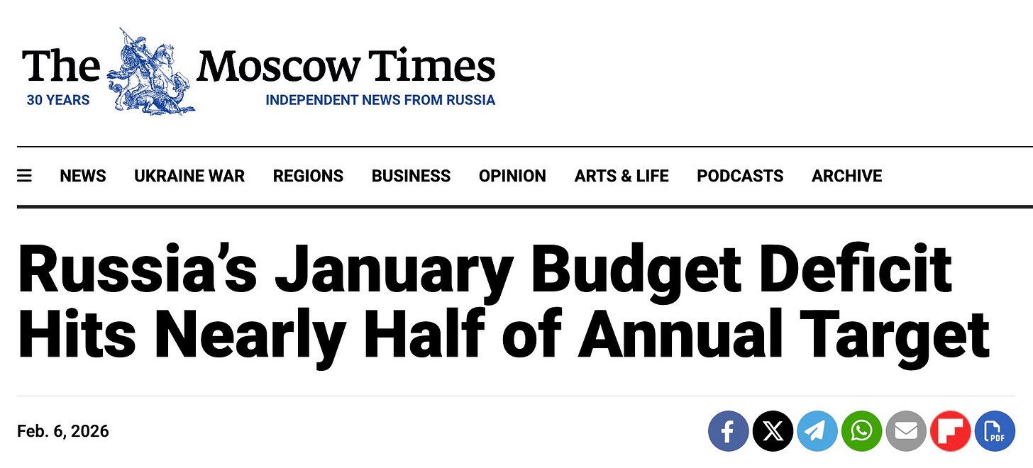 “Russia’s federal budget posted a deficit of 1.718 trillion rubles ($22.3 billion) in January, nearly half of its full-year target, according to Finance Ministry data published on Friday.