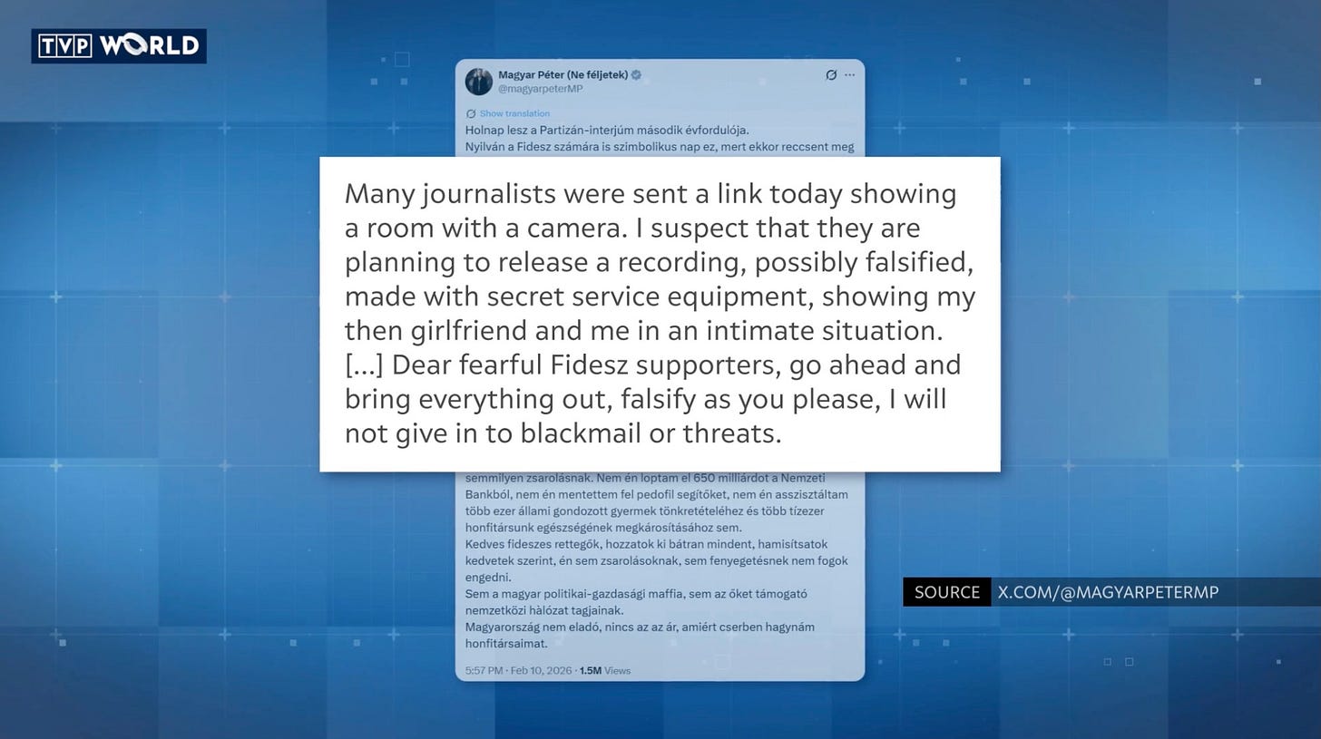 HUNGARY: With two months left before parliamentary elections in Hungary, the Polish public broadcaster Telewizja Polska’s TVP World English-language news channel aired a report at midweek saying people associated with Viktor Orbán’s Fidesz Party were about to release a possibly falsified sex tape involving Orbán’s main challenger Peter Magyar. Here’s a screen grab from the story.
